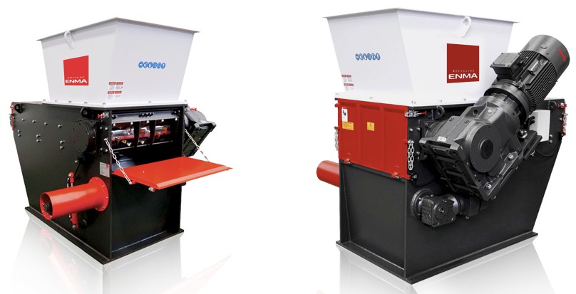 EnMa C300 Flat single-shaft small crusher features a linear hydraulic pushing system, a low-speed high-torque drive design, a space-saving direct connection between the motor and reducer, and an integrated electrical control system that can be put into use immediately after connecting to the power and equipped with external bearings, a 300mm diameter V-shaped rotor, and two rotor widths of 600 and 800mm for options. We use ENMA’s patented knife holder and blade design, and the user-friendly design makes cleaning and maintenance easy. The low speed of 60rpm allows the shredder to be shredded at a relatively low noise level. EnMa C300 can also be used in combination with EnMa G series granulator. The machine can be fed naturally or by a conveyor, and the discharge can be by a conveyor, air blower or spiral discharge.
